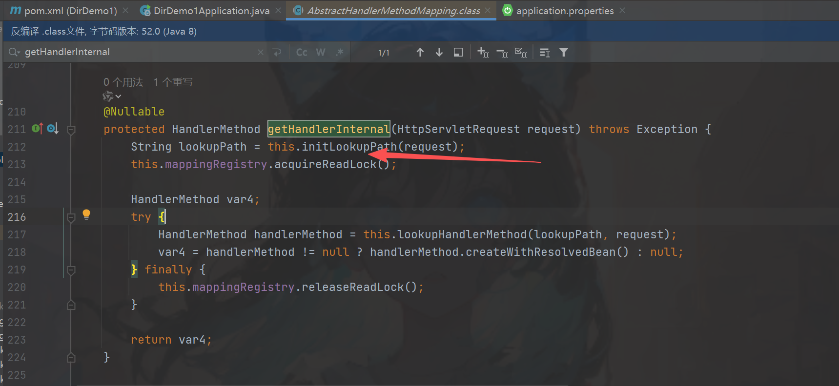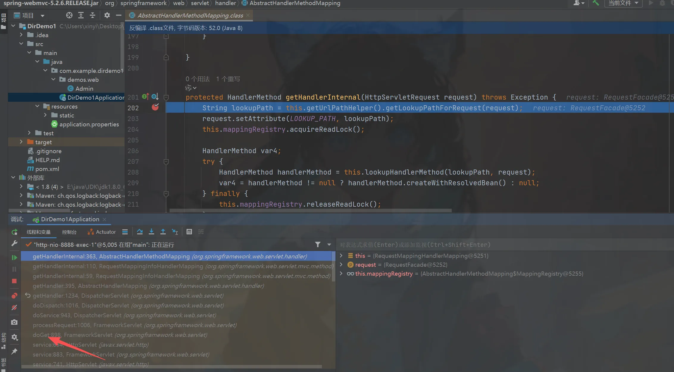首先我们在org.springframework.web.servlet.handler.AbstractHandlerMethodMapping类中找到getHandlerInternal方法进行断点分析,