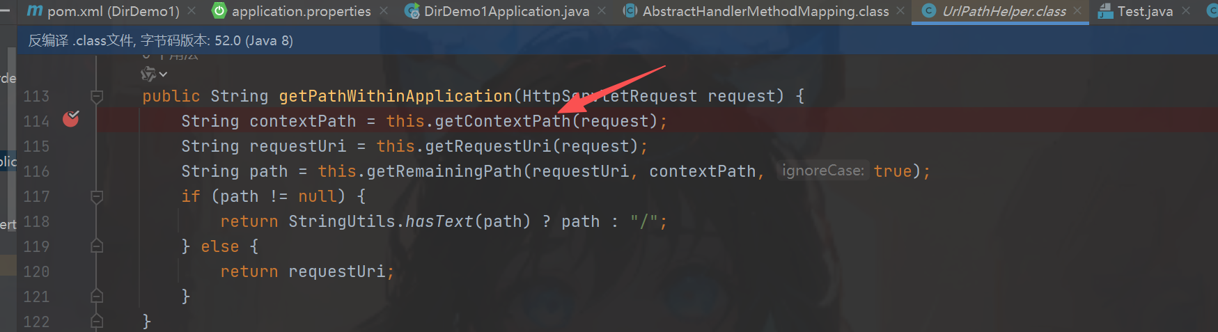 接着获取上下文路径,进行url解码然后在进行匹配请求路径是不是上下文的路径,最终匹配到了