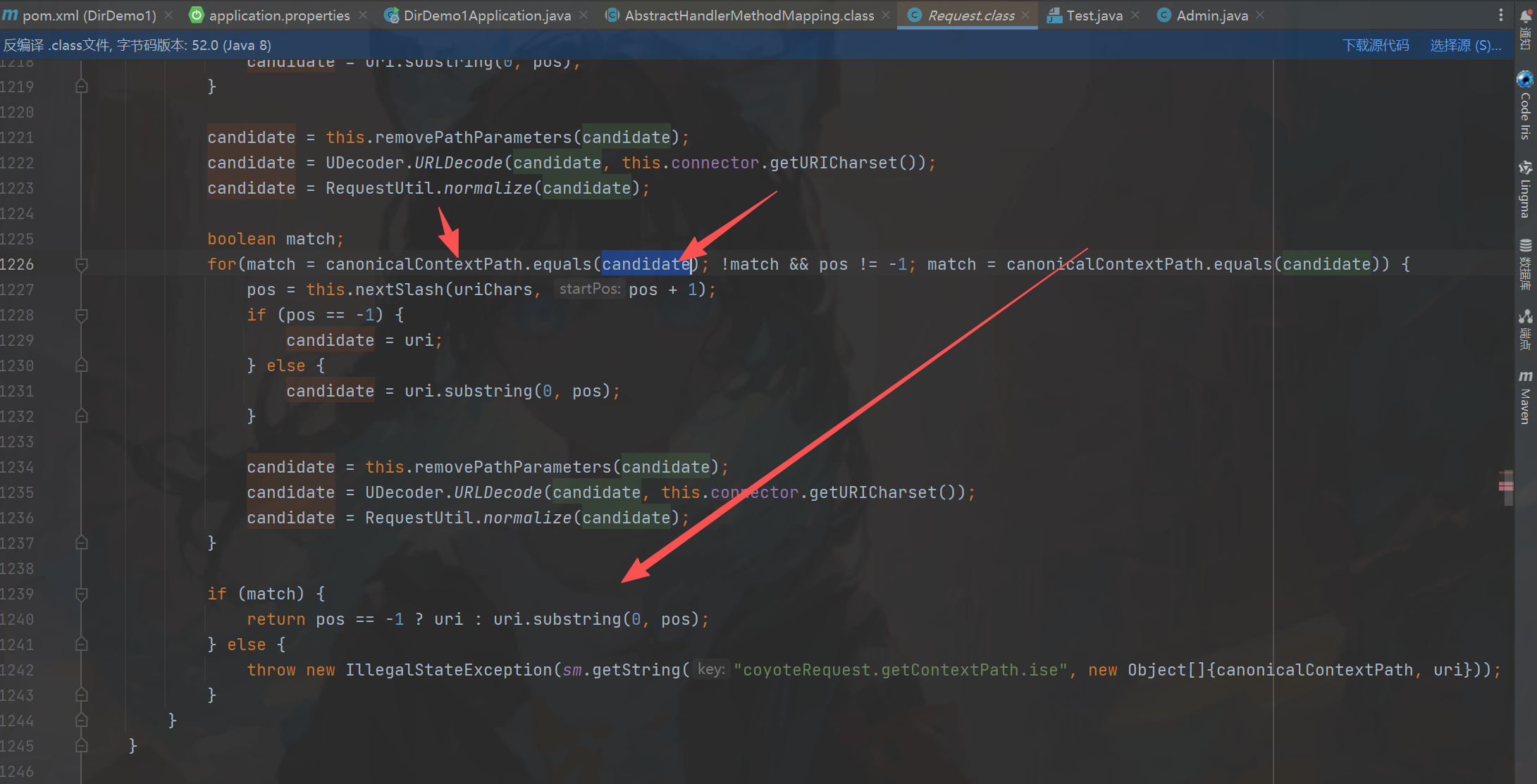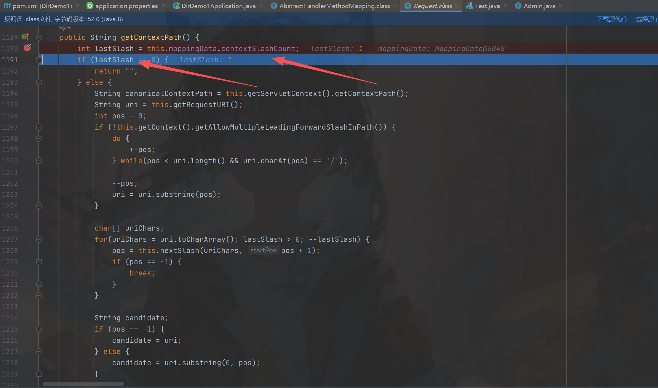 之后在1194行获取我们的上下文路径和1195获取我们完整的路由(getRequestURI())并且会把我们的上下文路径进行一次url解码之类的,