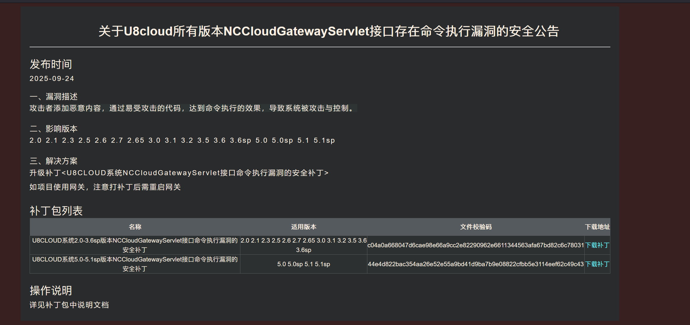[https://security.yonyou.com/#/patchInfo?identifier=9695976d67dd4786badf91df6cb6578c](https://security.yonyou.com/#/patchInfo?identifier=9695976d67dd4786badf91df6cb6578c)