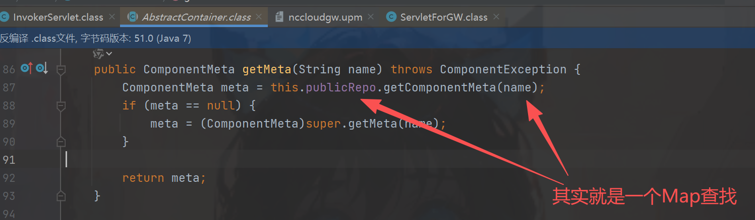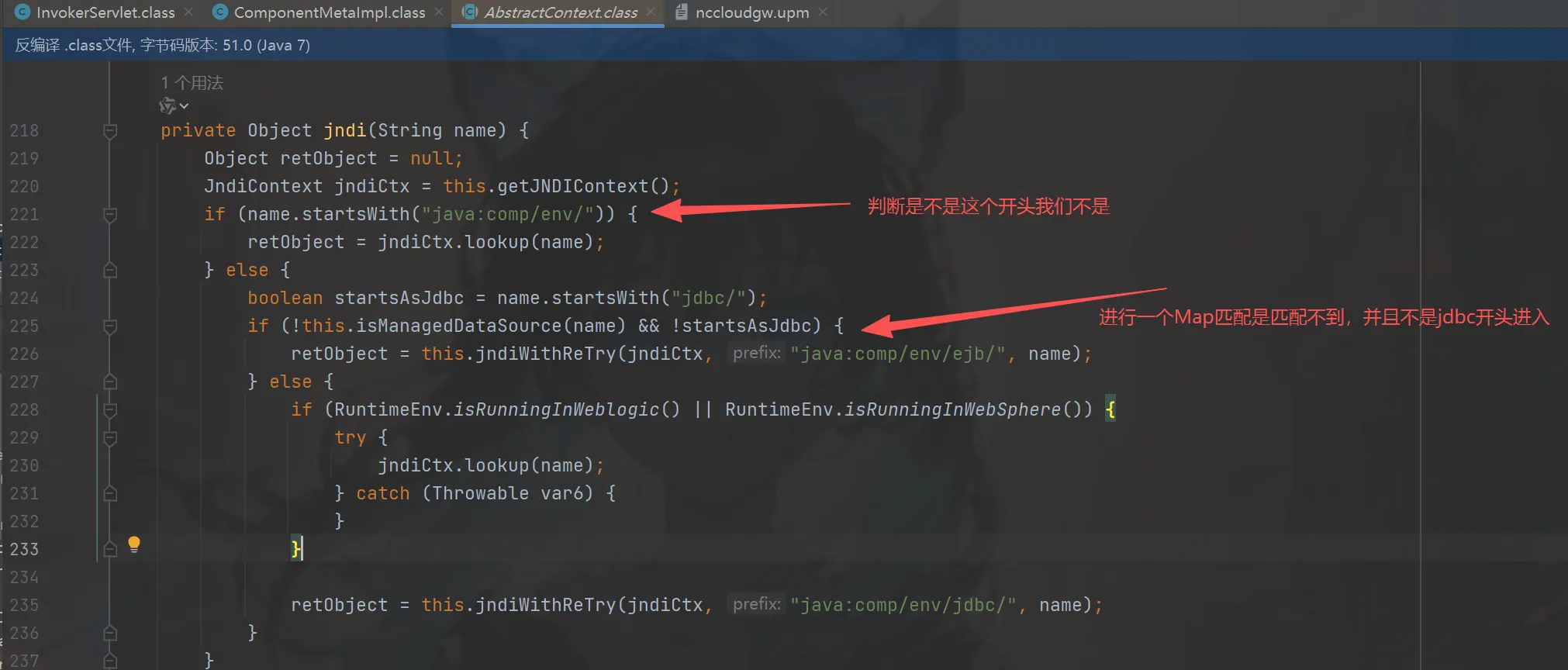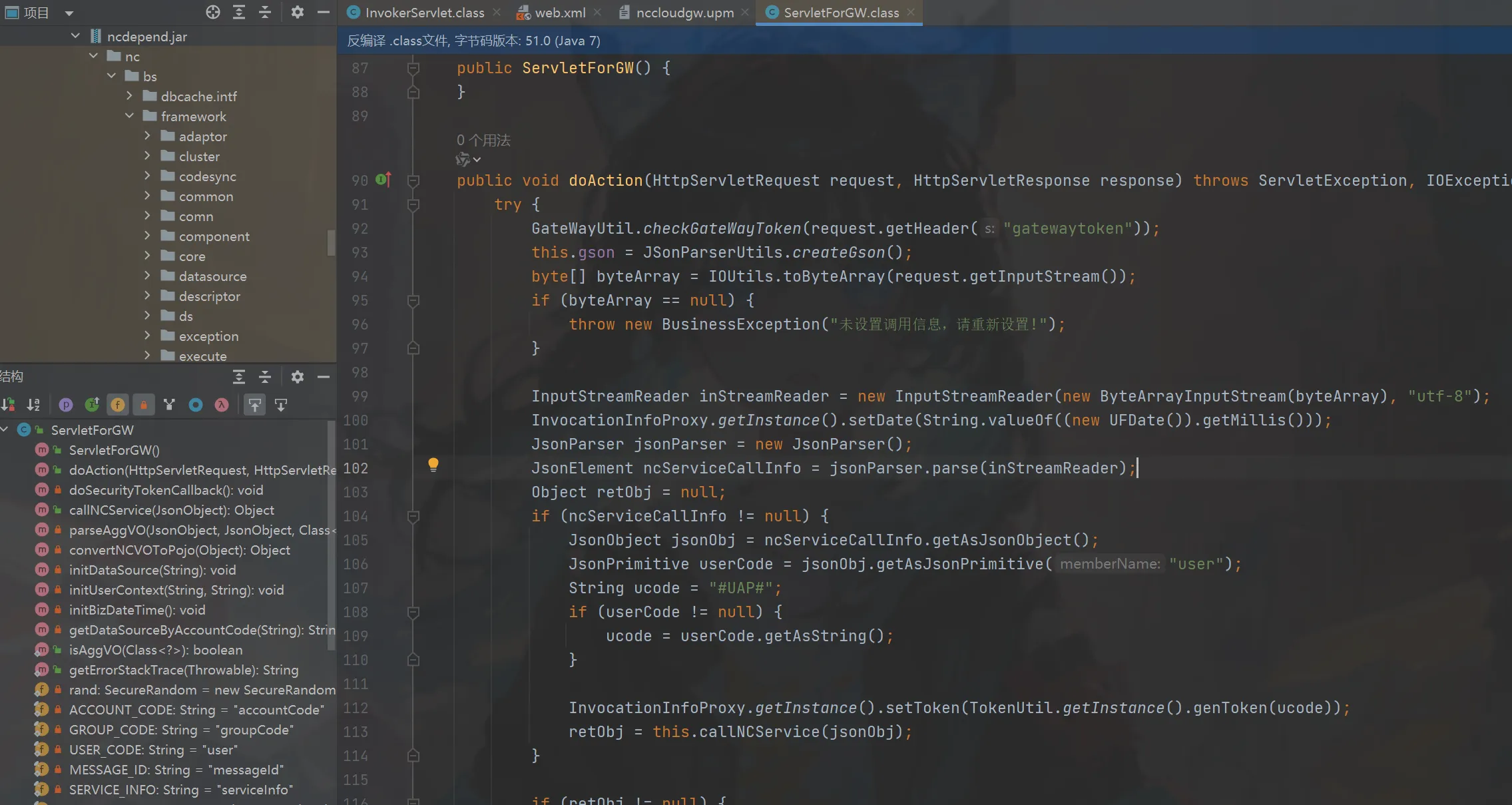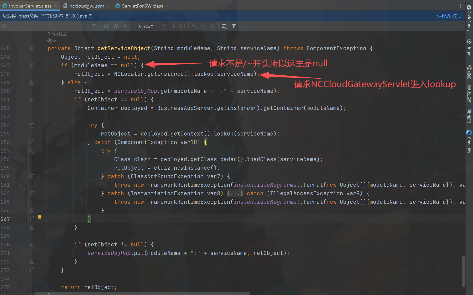 反编译查看补丁,接着通过补丁标题定位这个类但是并没没有找到NCCloudGatewayServlet,那么我们全局搜索一下找到了,发现其实是