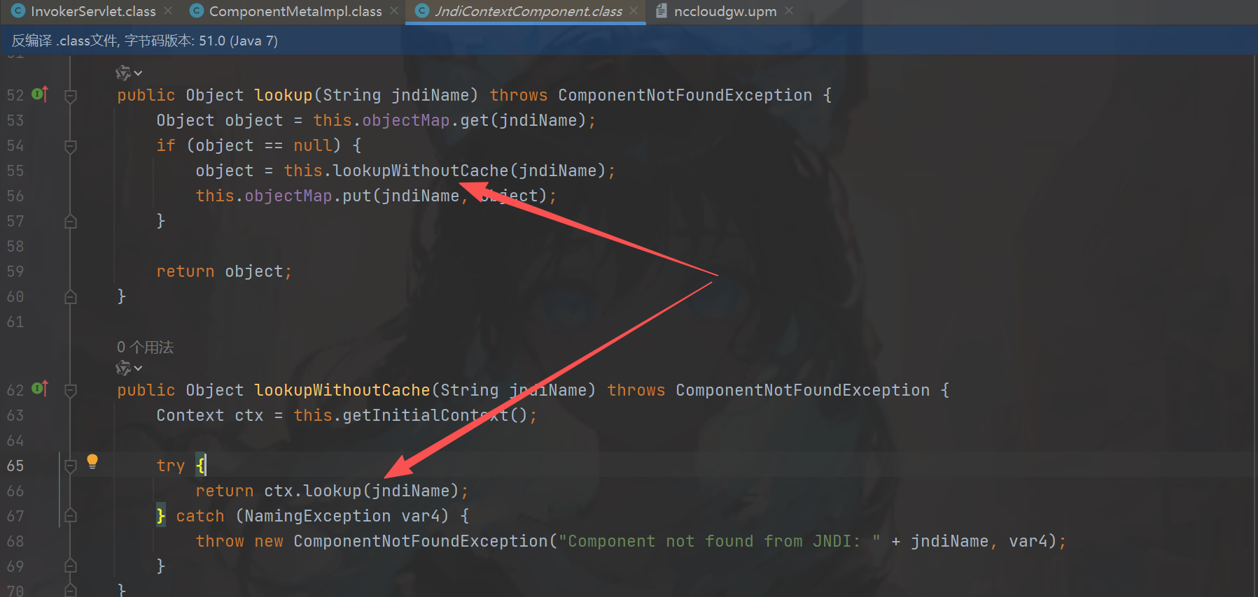进去之后可以看到进入lookup图一,根据名字我们这里其实是进行了jndi注入的事实也确实这样不着急先一步一步来看图二,我们可以看到图二中开头是