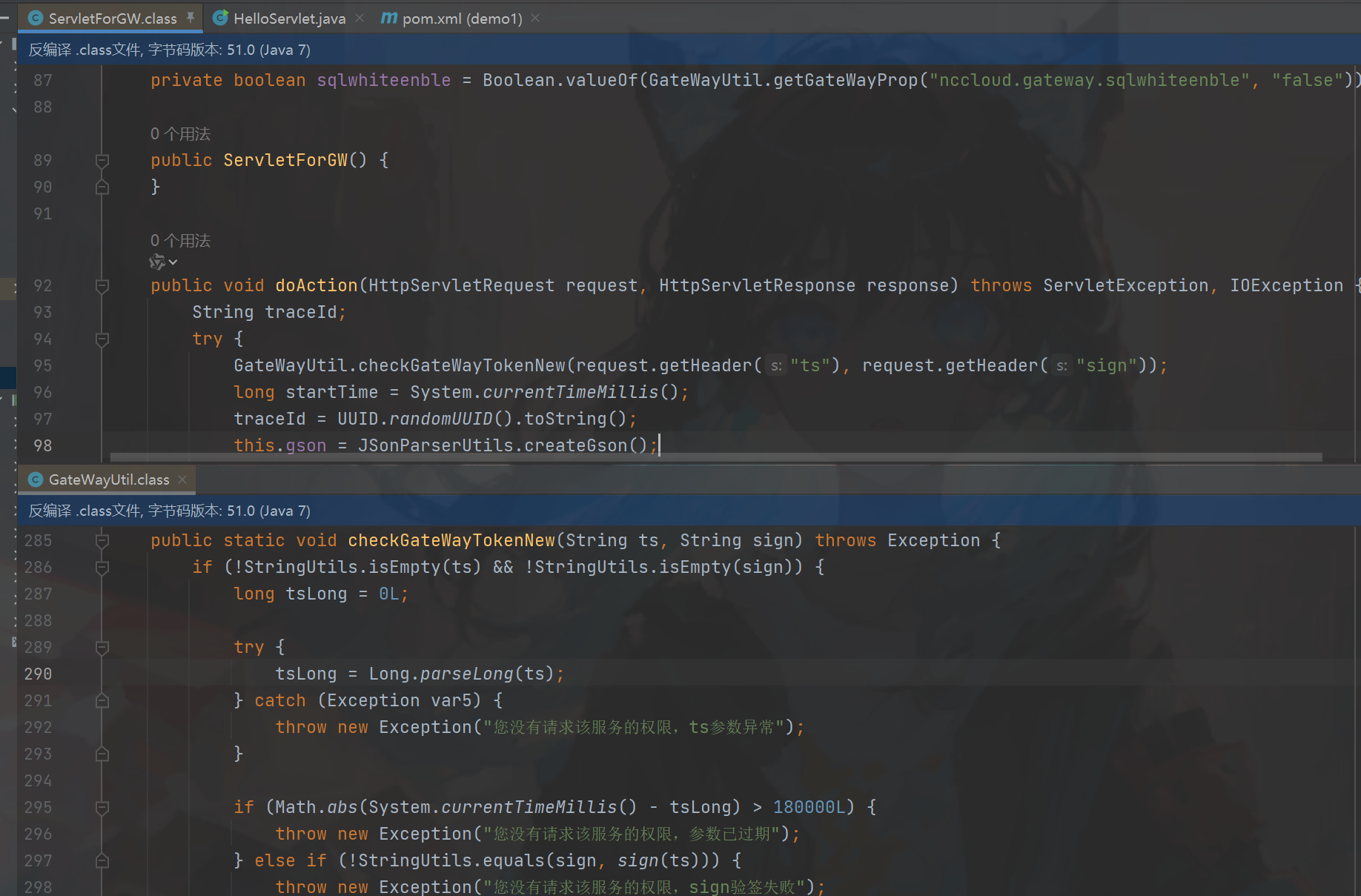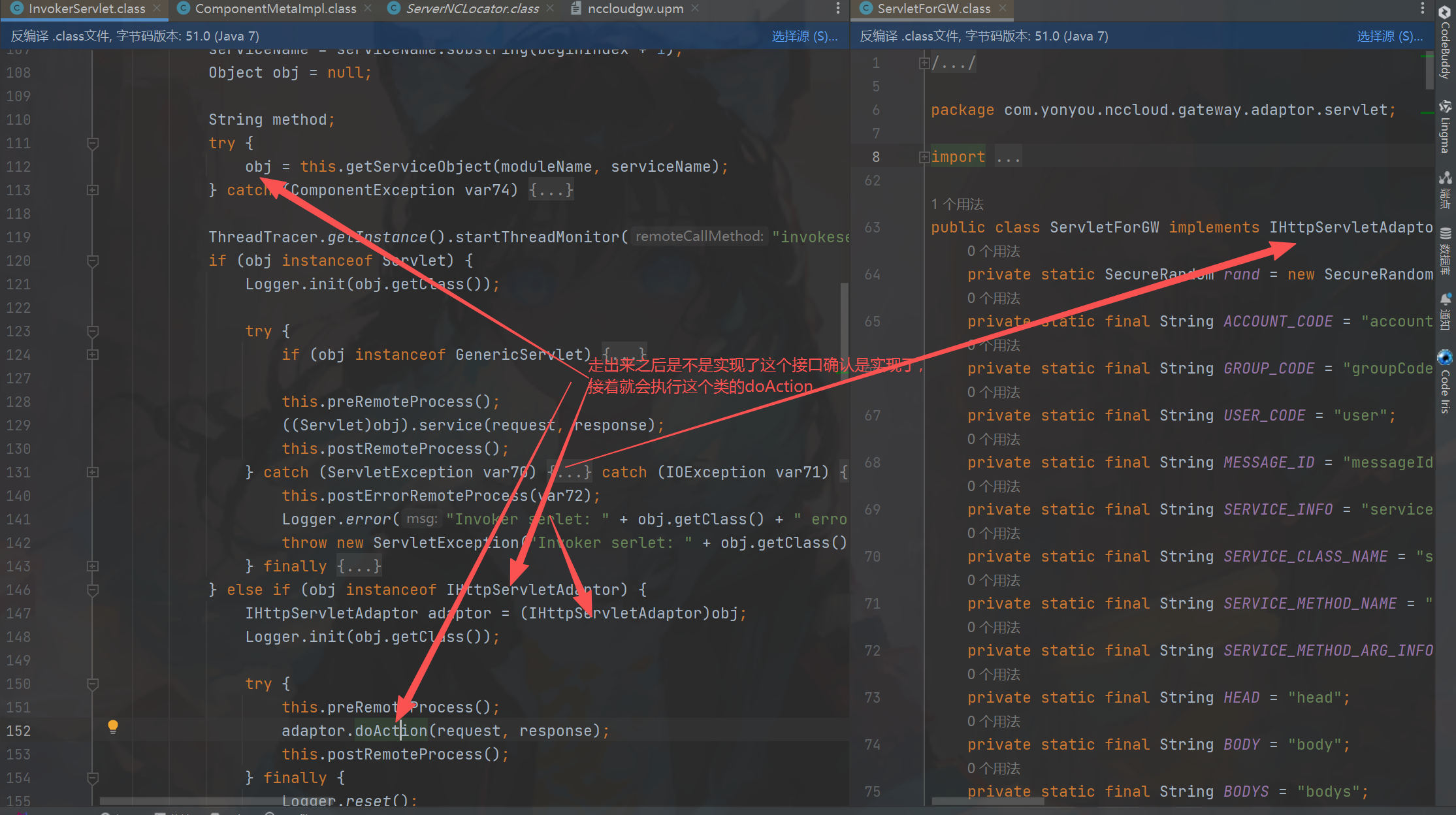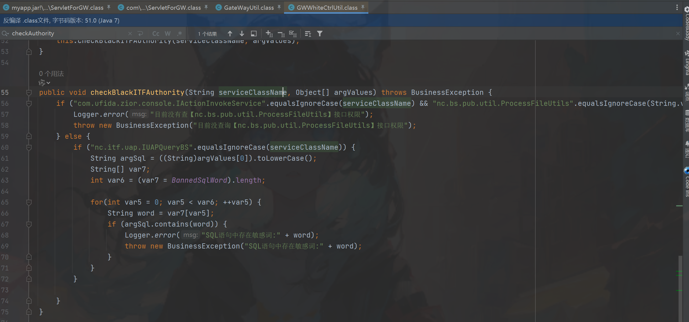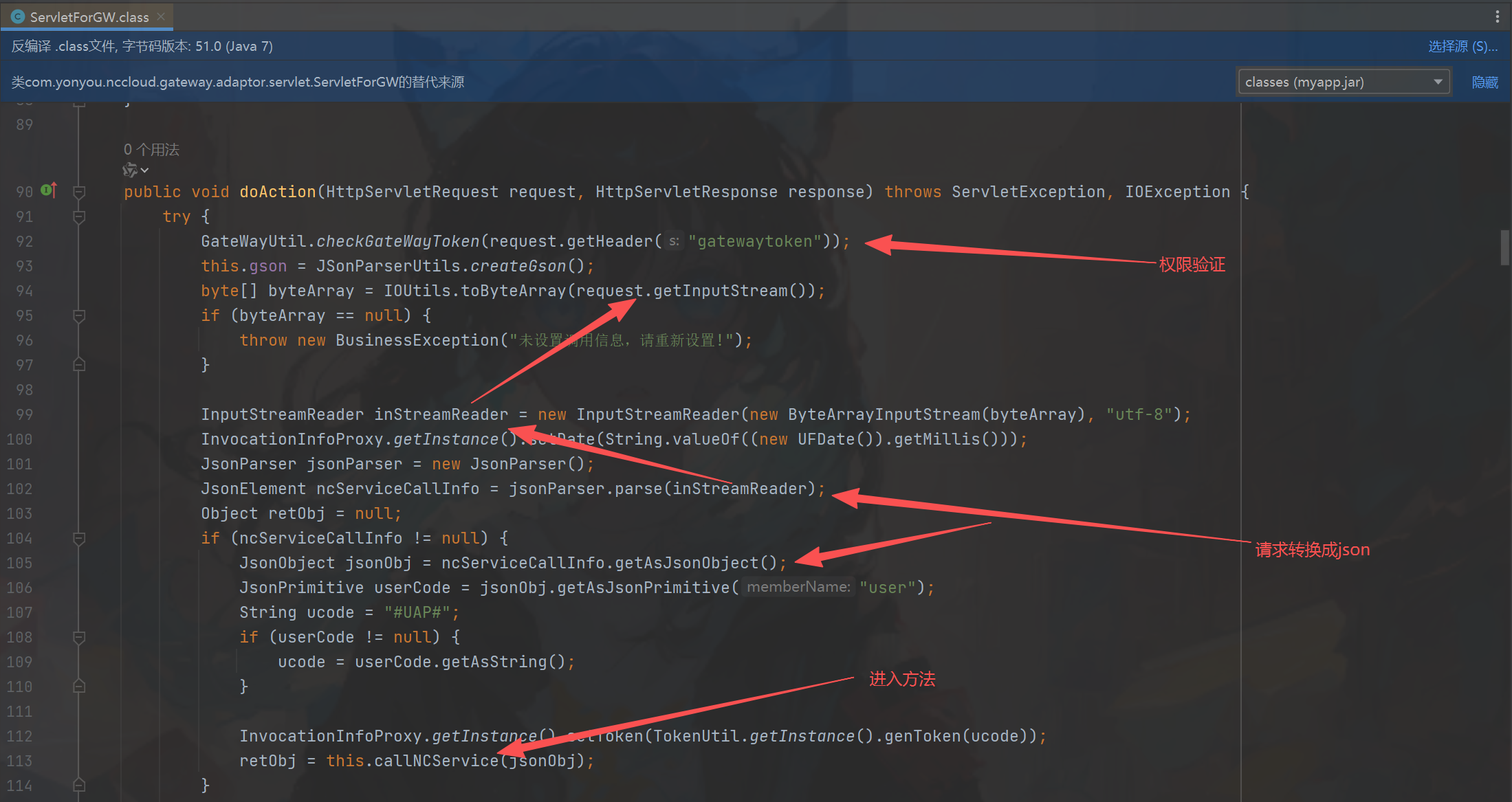 com.yonyou.nccloud.gateway.adaptor.servlet.ServletForGW 这个类图一,那么我们也在补丁中找到了这个文件,既然是这个类原因我们进去看看(图二),