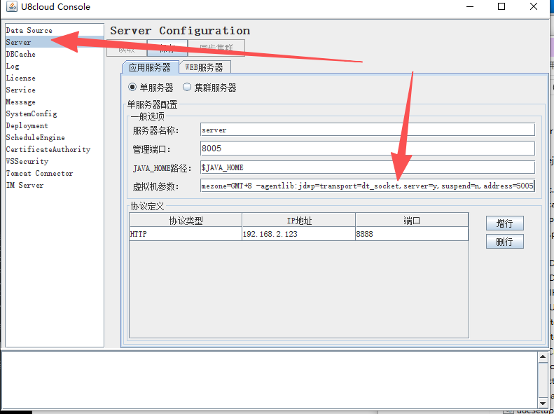 再就是远程调试了这里我通过修改启动文件startup.bat发现并没有启任何作用,其实用友是专门有程序来解决这个调试问题的,E:\U8CERP\bin\u8cSysConfig.bat 启动这个程序后面添加(图一)