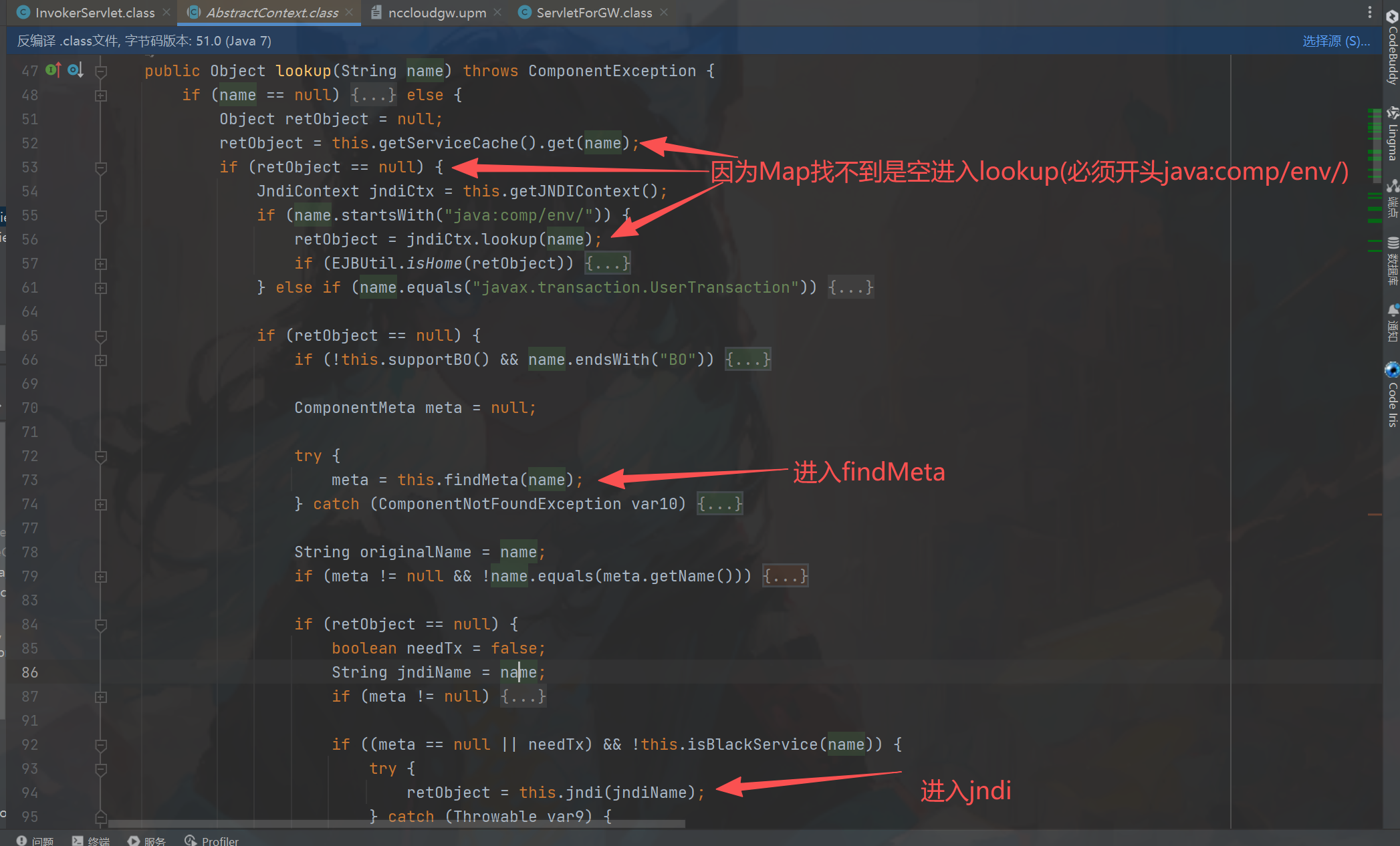 java:comp/env/但是我们并不是所以不会走到lookup这里其实就是进行了jndi注入但是不可控,问题不大那么就会走到图二中的findMete方法图三实际上里面是存在一个黑名单