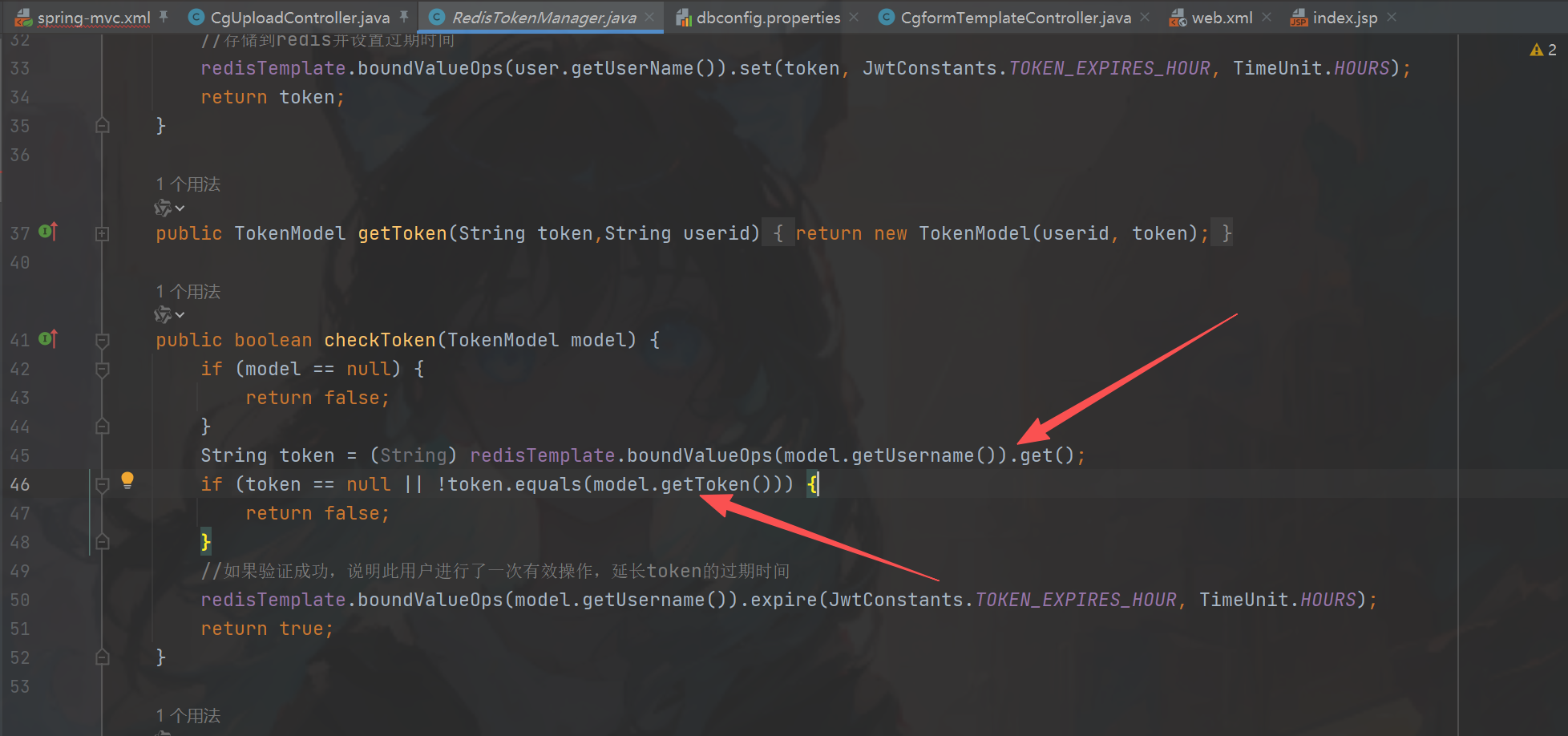 进入下面图一之后可以看到是通过45行进行获取了redis中的key对应的value,之后在对我们传入的jwt和他查询的进行比较,