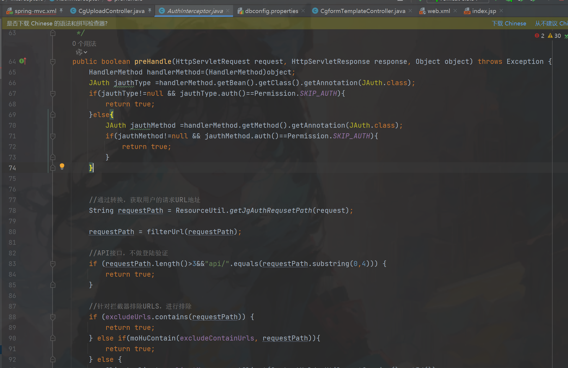 org.jeecgframework.core.interceptors.AuthInterceptor进入65-74行都是查看我们路由存在不存在