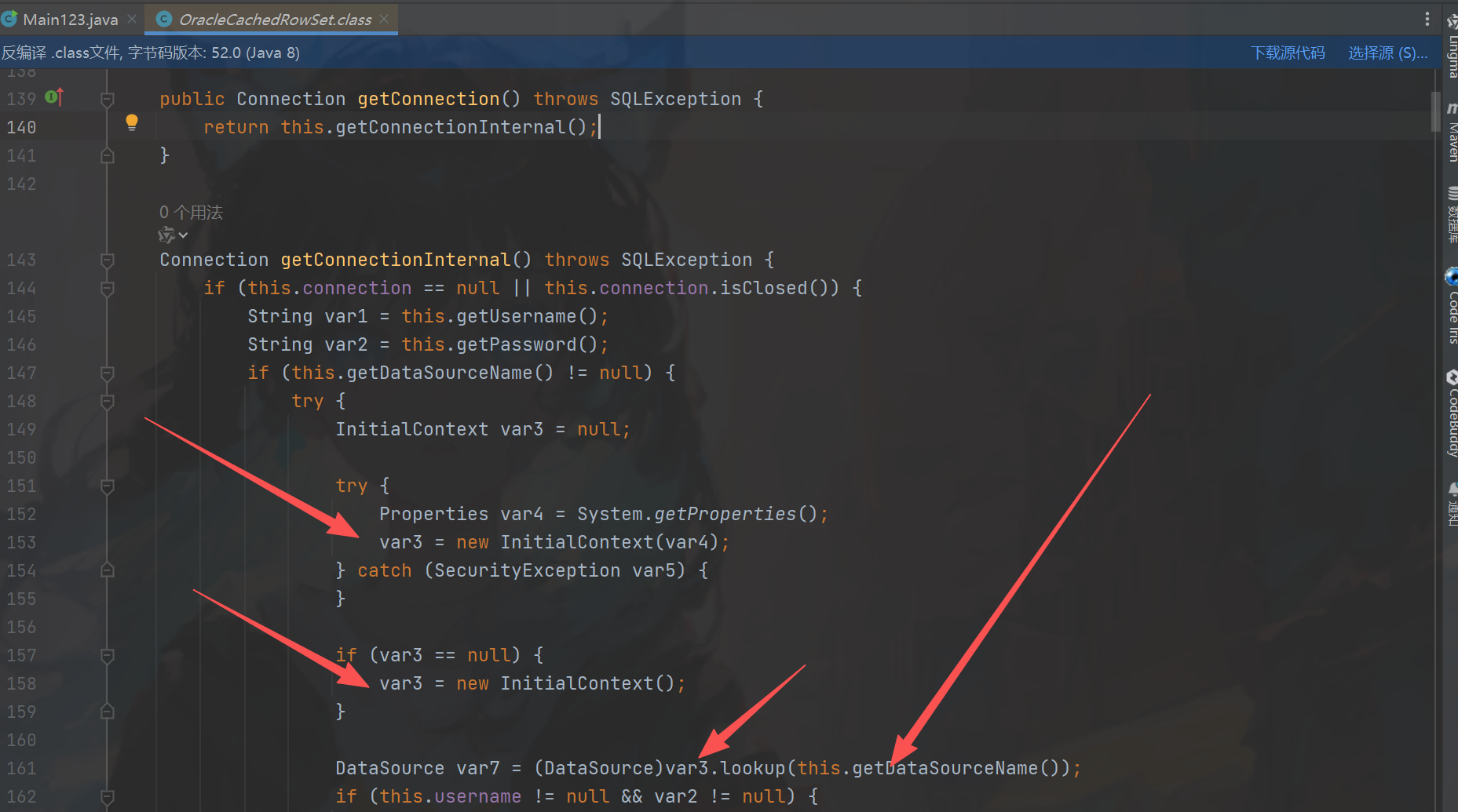 那么刚好在上面getConnection中存在调用getConnectionInternal,看到这里根据以前学的知识很快想到了用过Getter执行,首先先打一下jndi图二代码一。