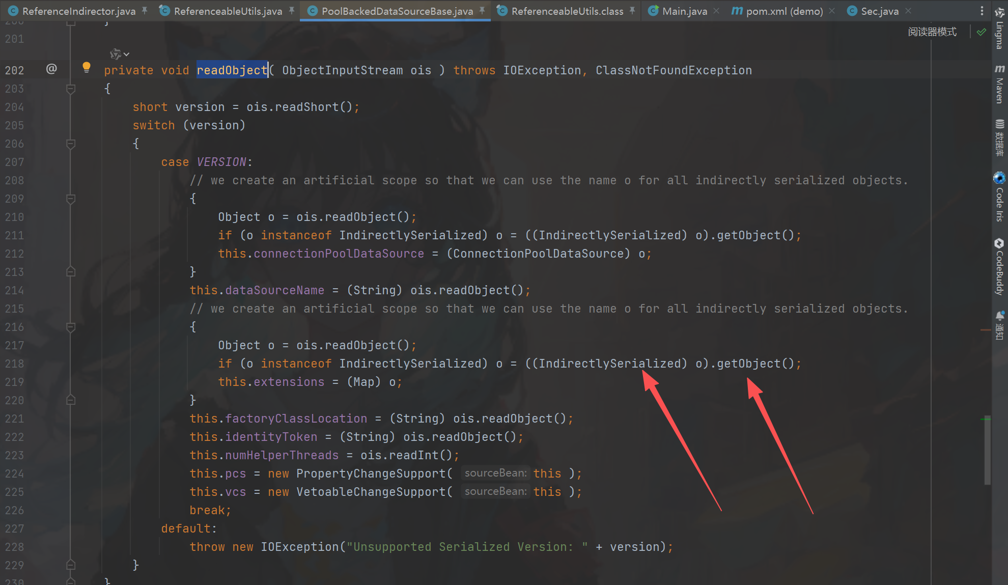 PoolBackedDataSourceBase#readObject图一,其中可以看到会调用任意的getObject(),但是必须得实现了