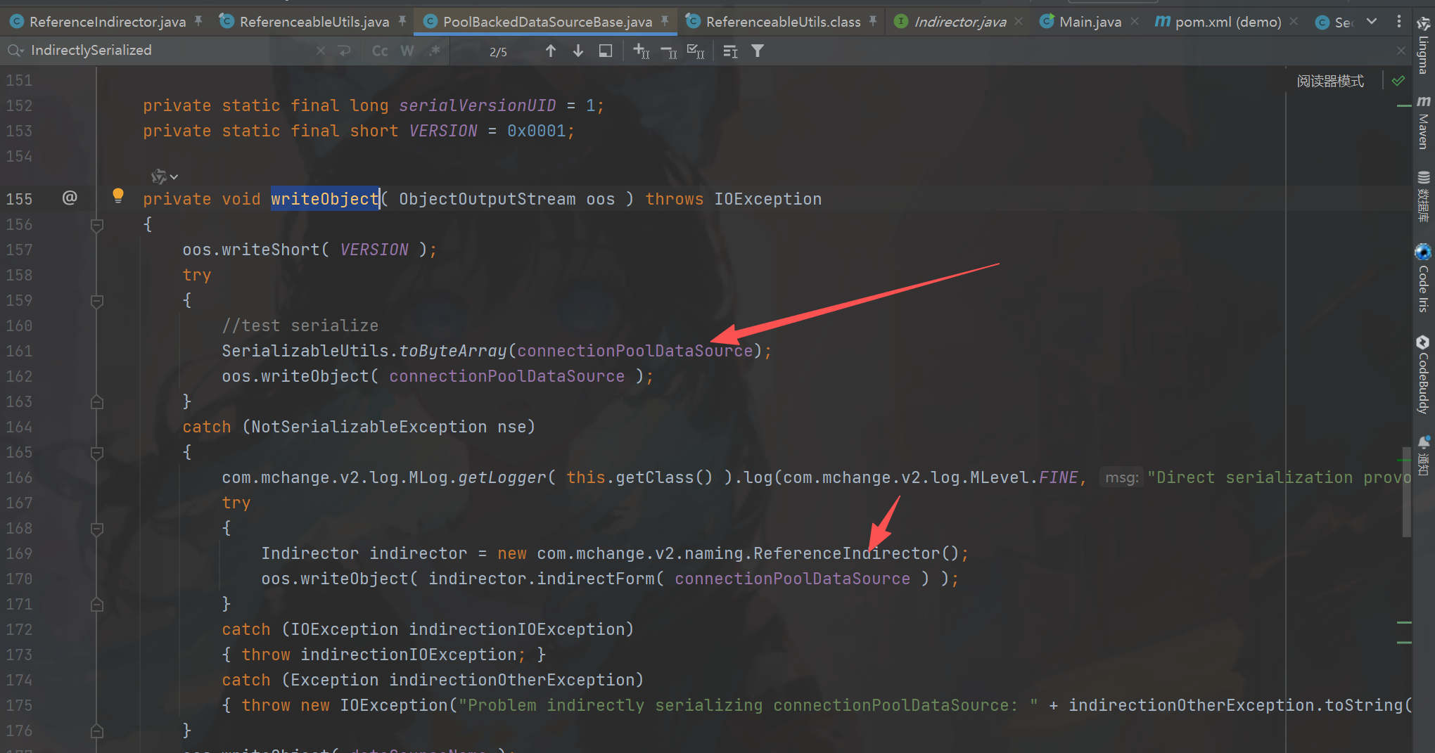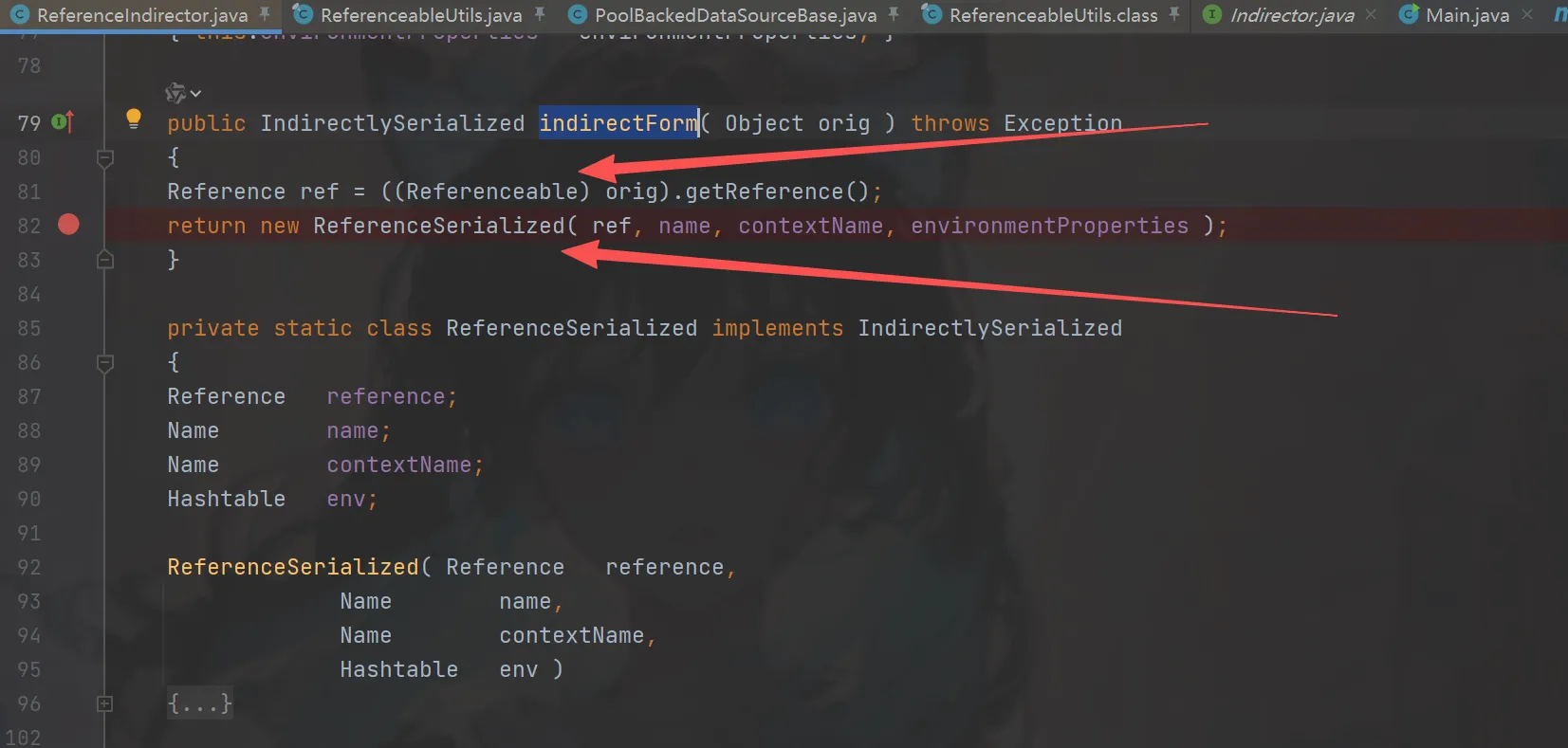 connectionPoolDataSource里面并没有实现Serializable,会走到catch其中执行到了ReferenceIndirector#indirectForm图二,