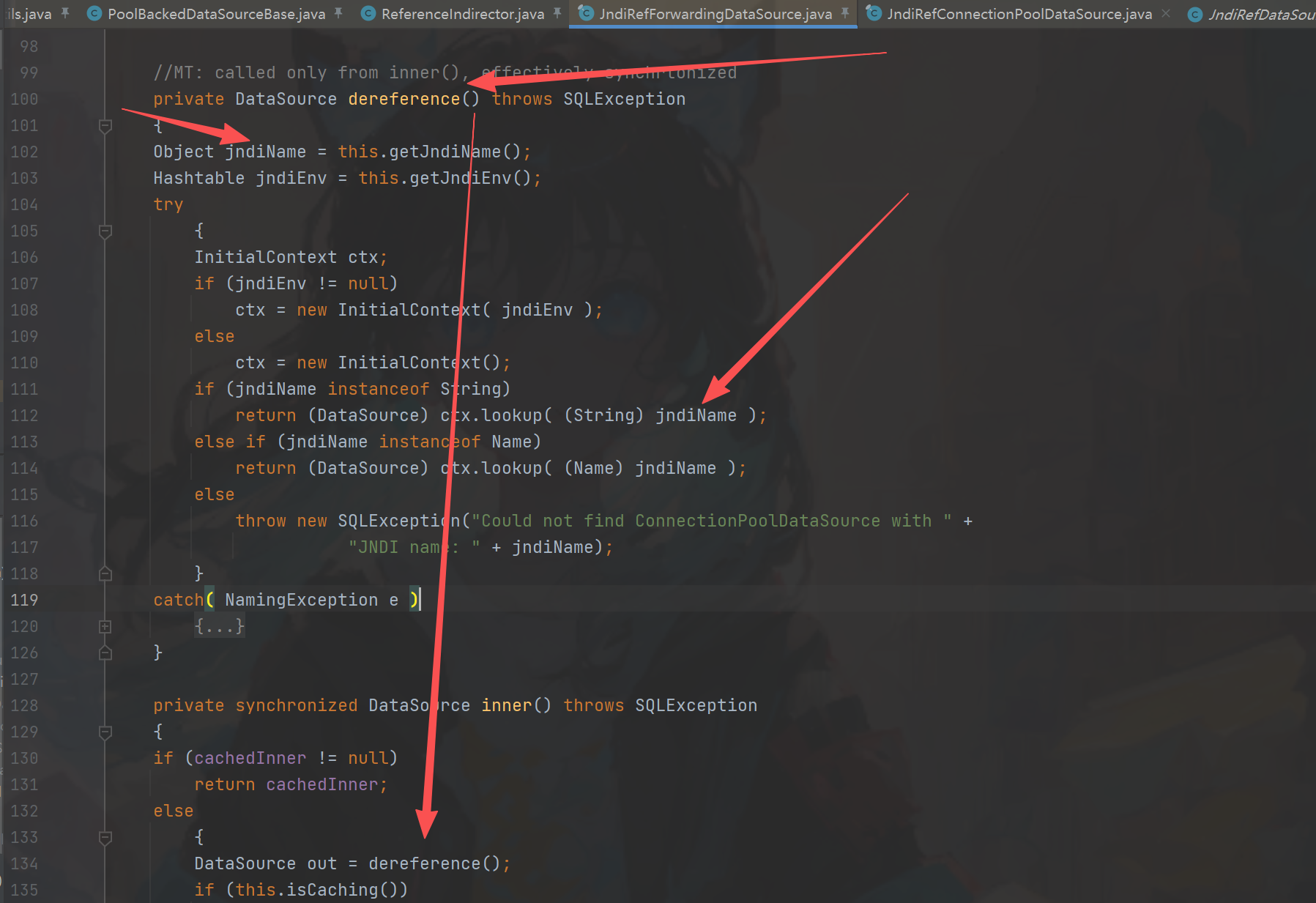也不难JndiRefForwardingDataSource#dereference中存在JNDI注入图一,this.getJndiName()是可以控制的,