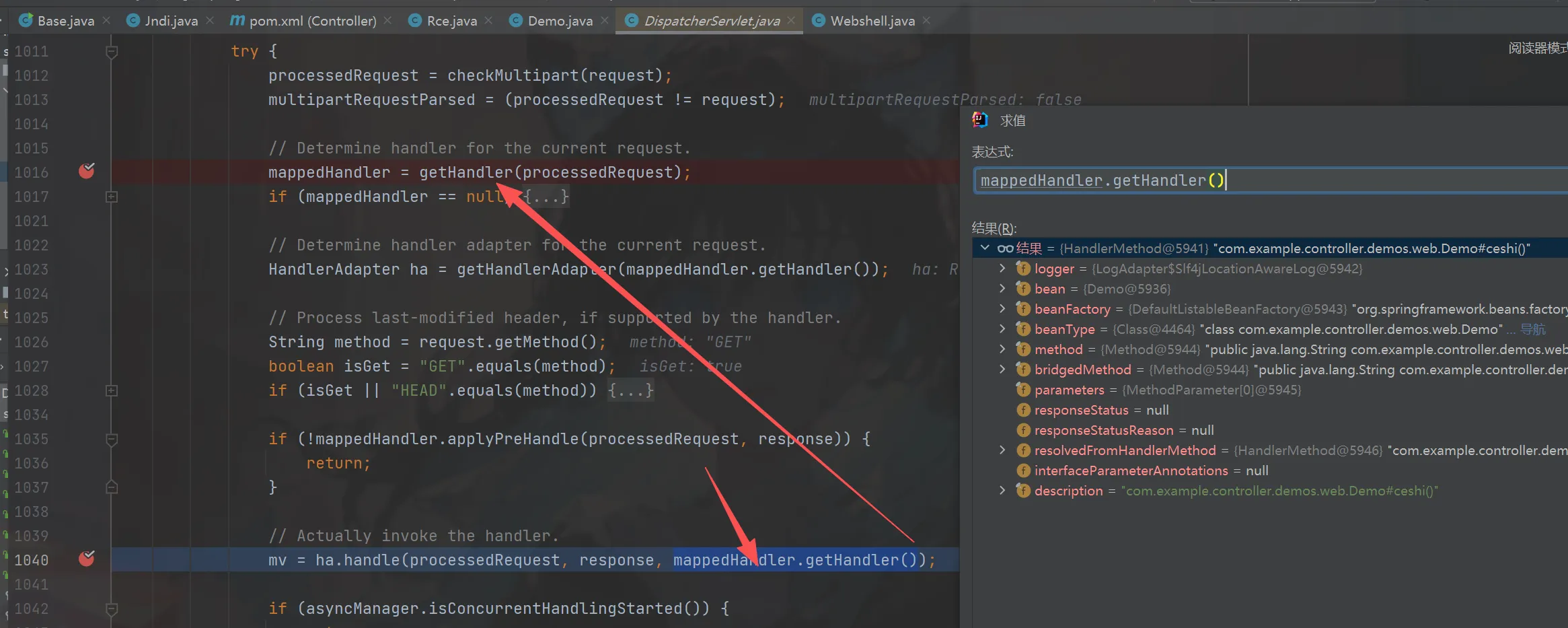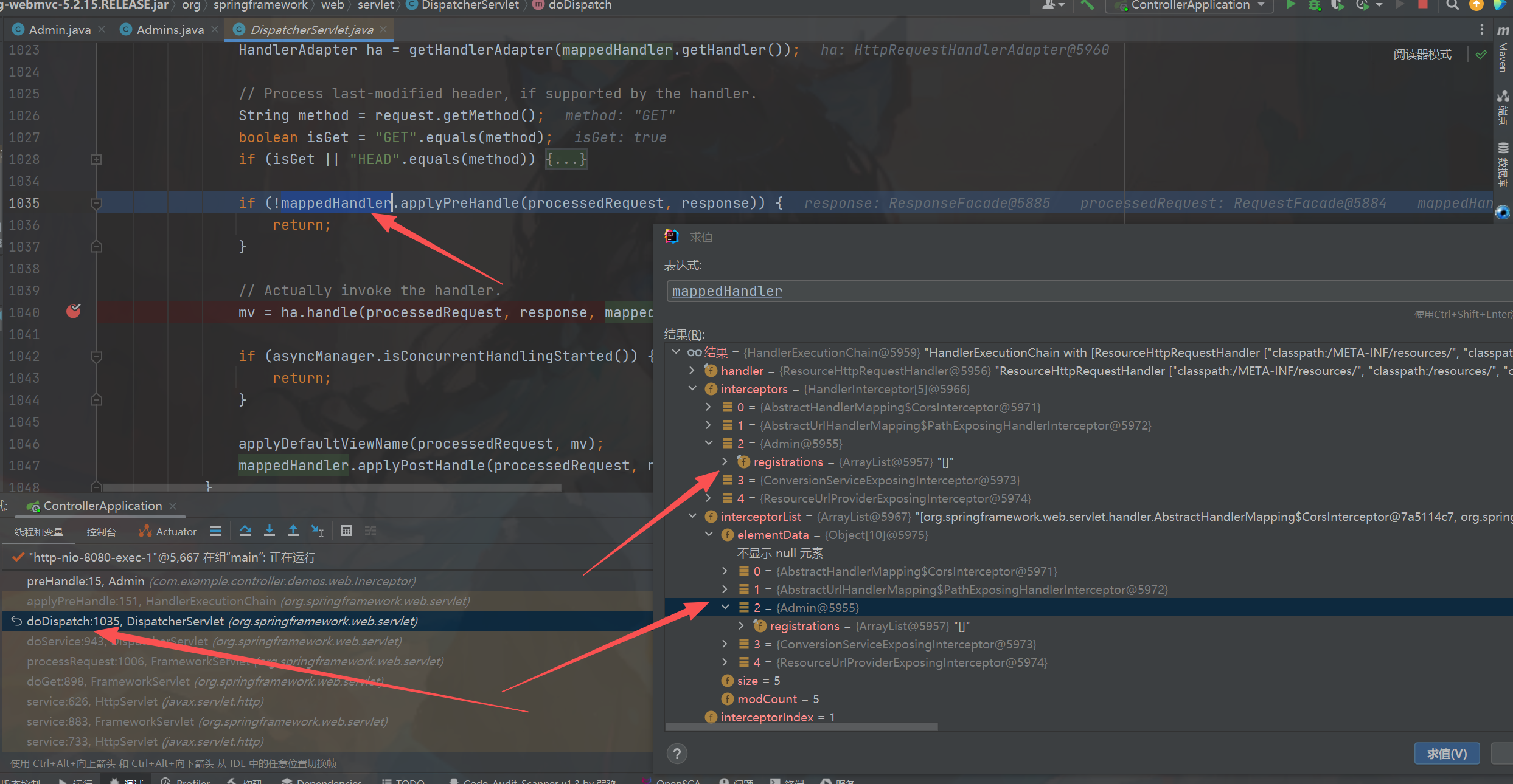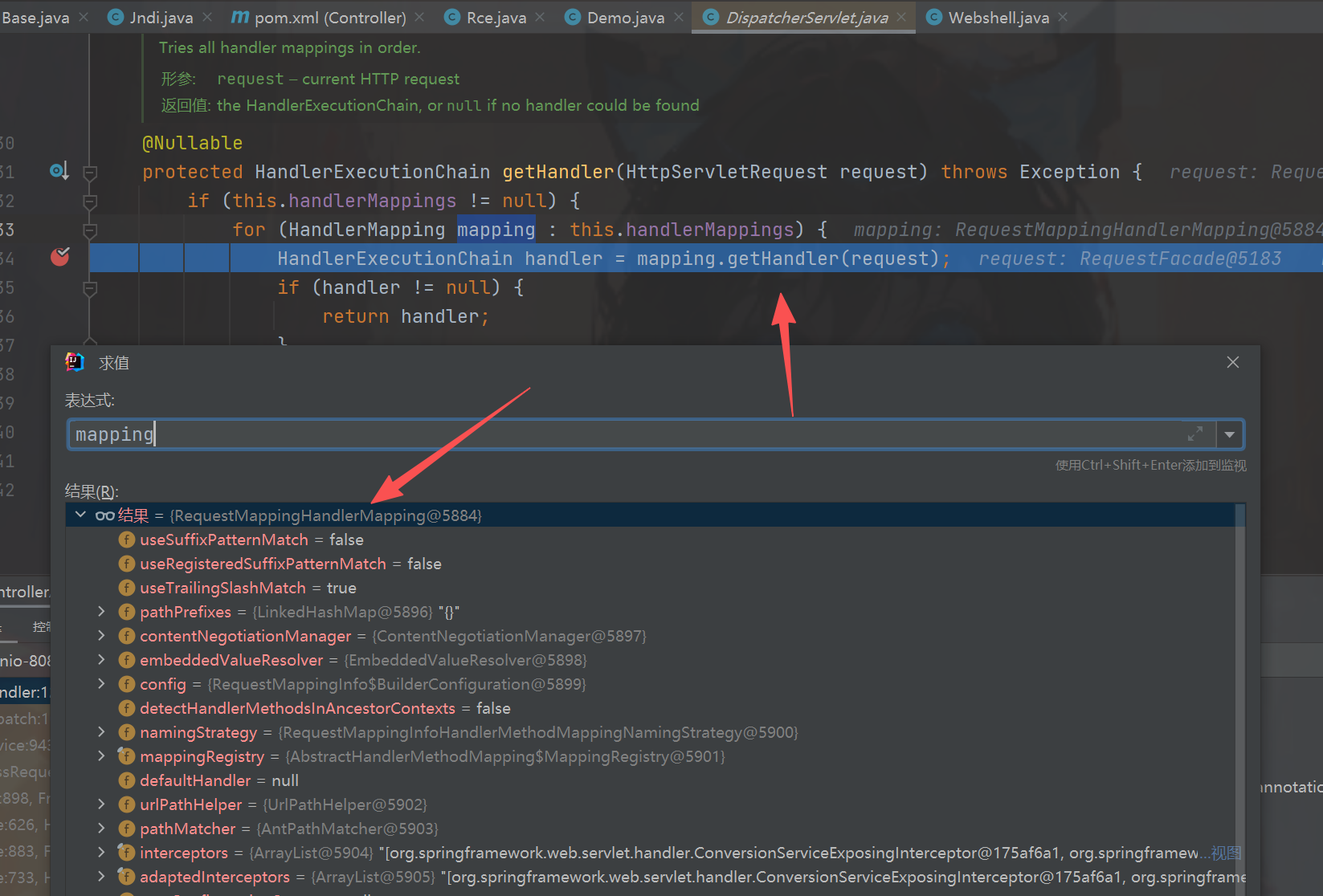 给了断点之后直接看到了我们的老输入doDispatch方法图一,依旧是从getHandler方法获取的循环到