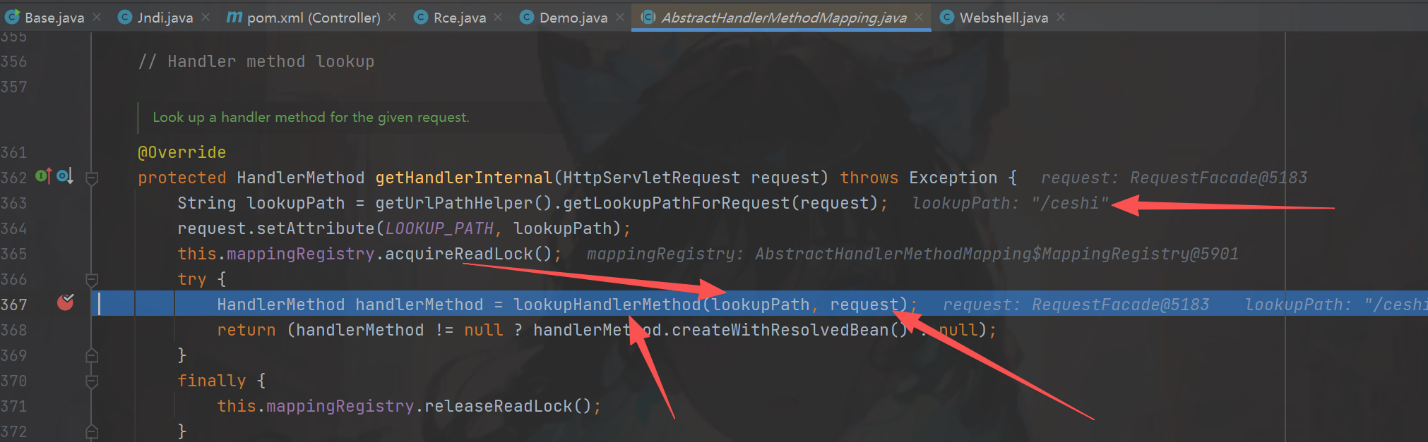 进入之后再进入到getHandlerInternal方法,可以看到获取了我们的请求,拿到了request进入lookupHandlerMethod方法图一,