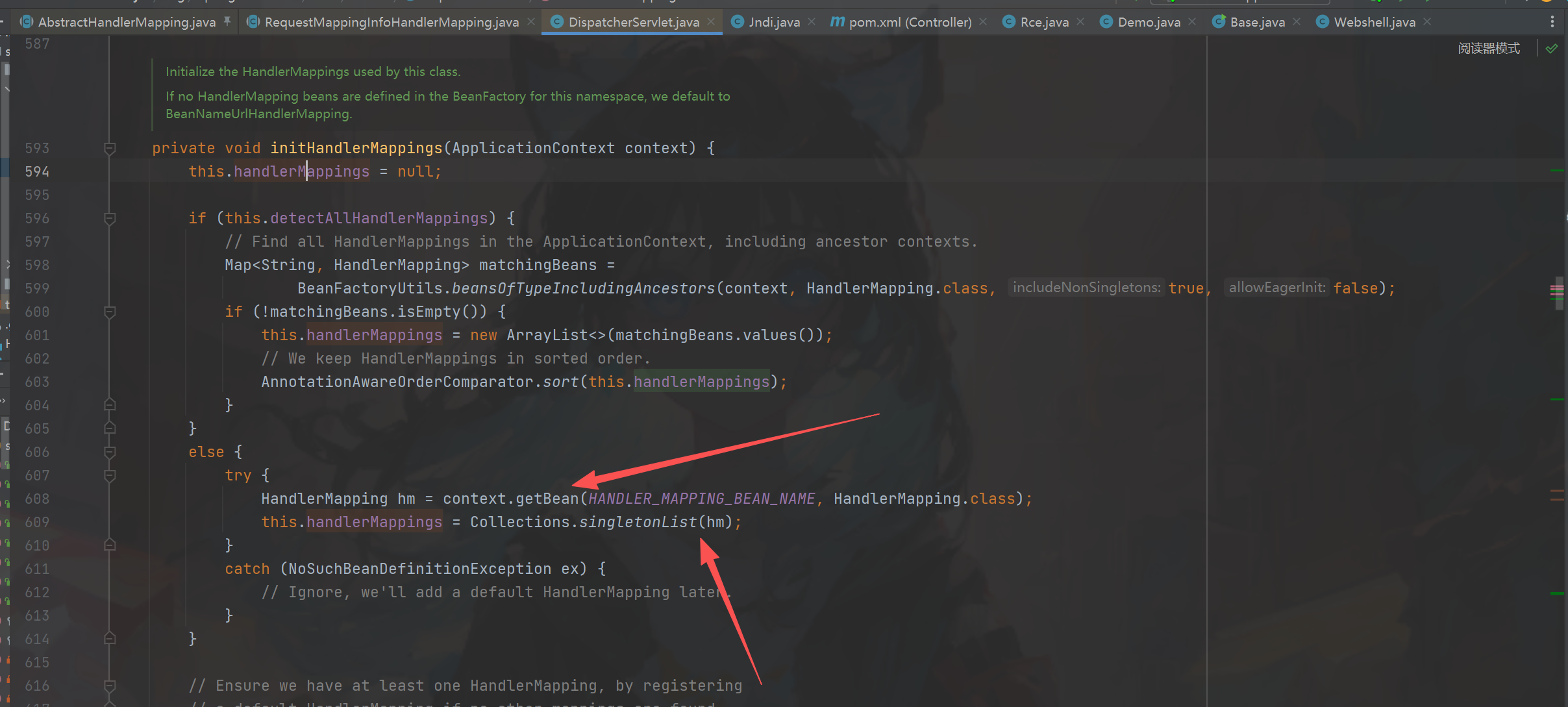 了getHandler方法那么现在的问题是如何拿到RequestMappingHandlerMapping,发现找到可以使用getBean来获取图三,