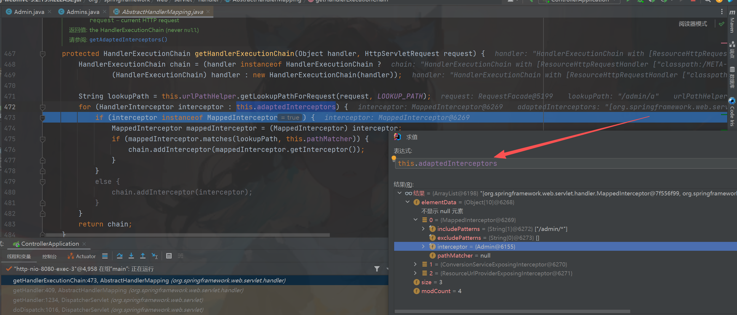 this.adaptedInterceptors图三,虽然当前类是AbstractHandlerMapping但是我们可以拿到他的子类。
