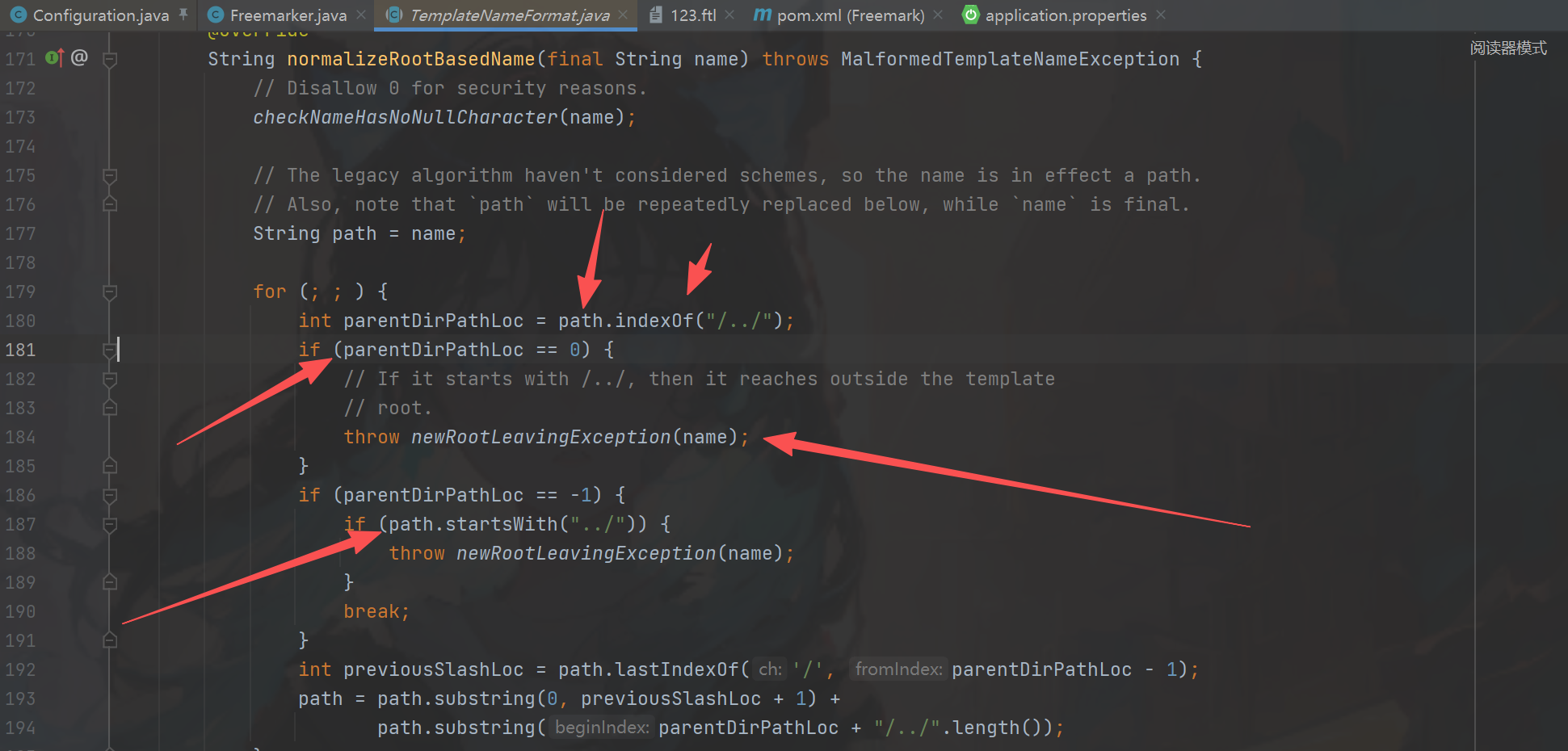 在这个Configuration#getTemplate方法里面是存在过滤TemplateNameFormat#normalizeRootBasedName图一,其中我们可以看到180