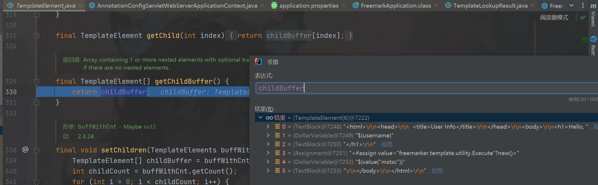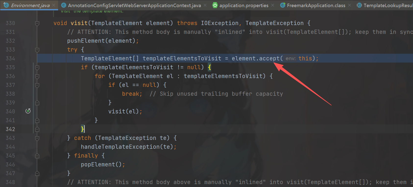下面我们debug进行调试解决如何产生的,Environment#process图一,其中getTemplate().getRootTreeNode()就是获取到了我们的内容跟