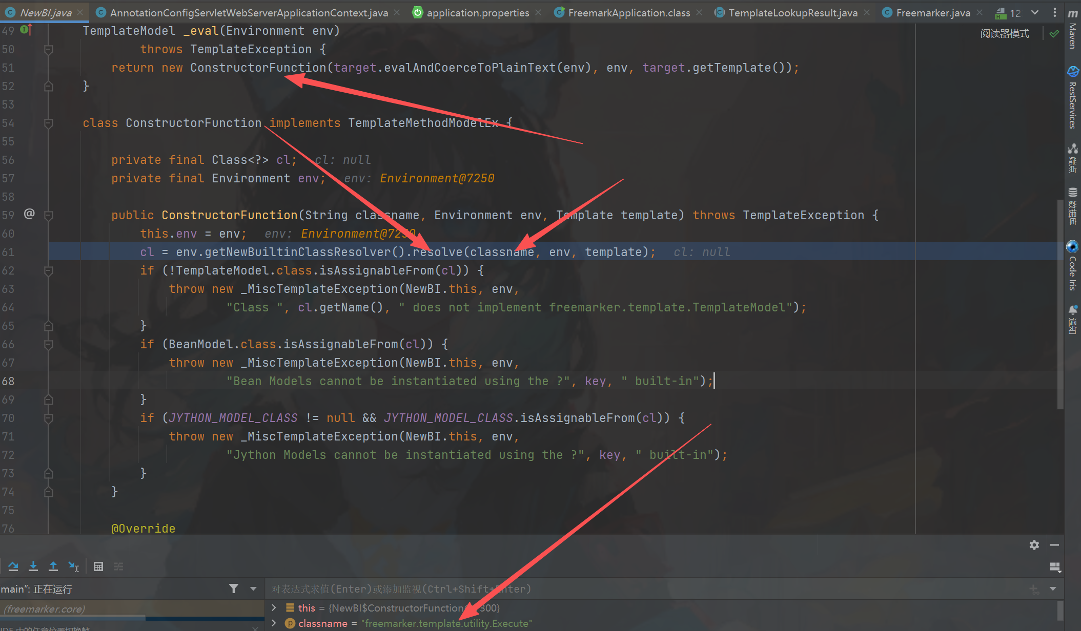 这里是实现了TemplateScalarModel接口那么modelToString其实就是返回类完整全限类名的字符串,目的是什么呢?没错其实就是动态加载类会返回到NewBI#_eval方法中图二,