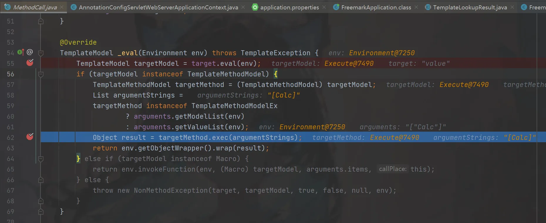 跟进去就是一路的eval方法一直跟到下面图一,会判断我们的插入的freemarker.template.utility.Execute是不是实现了TemplateNumberModel或者TemplateDateModel